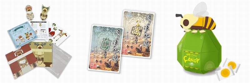 かわいい「アイルーおりがみメモ」。渡りの凍て地をイメージした、ハンターさんにはおなじみのハチミツと回復薬風「入浴剤」。おみやげにぴったりの「回復ミツムシキャンディー(はちみつかりん飴)」。