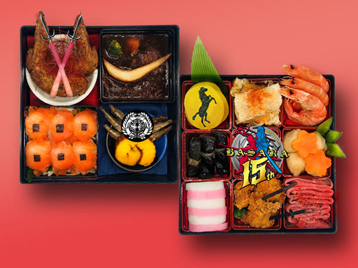 1段目の伊達政宗・真田幸村をモチーフとした牛タンシチューと六文銭の手毬寿司をメインに、2段目にはゲーム内アイテムをイメージした豪華な彩りある具材を使用。ひょうたんに入れた神水も併せて武将になった気分でお召し上がりいただけます。15周年のお祝いメニューをぜひ皆様でお楽しみください。
