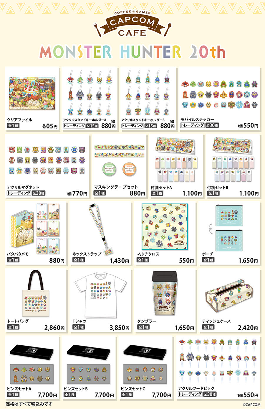 20周年を記念して描かれたカプコンカフェオリジナルイラストにはアイルーやプーギーなどのお馴染みのキャラクターや歴代のモンスターたちが大集合!!20周年期間を盛り上げる、毎日に普段使いしやすいアイテムをたくさんご用意いたしました。