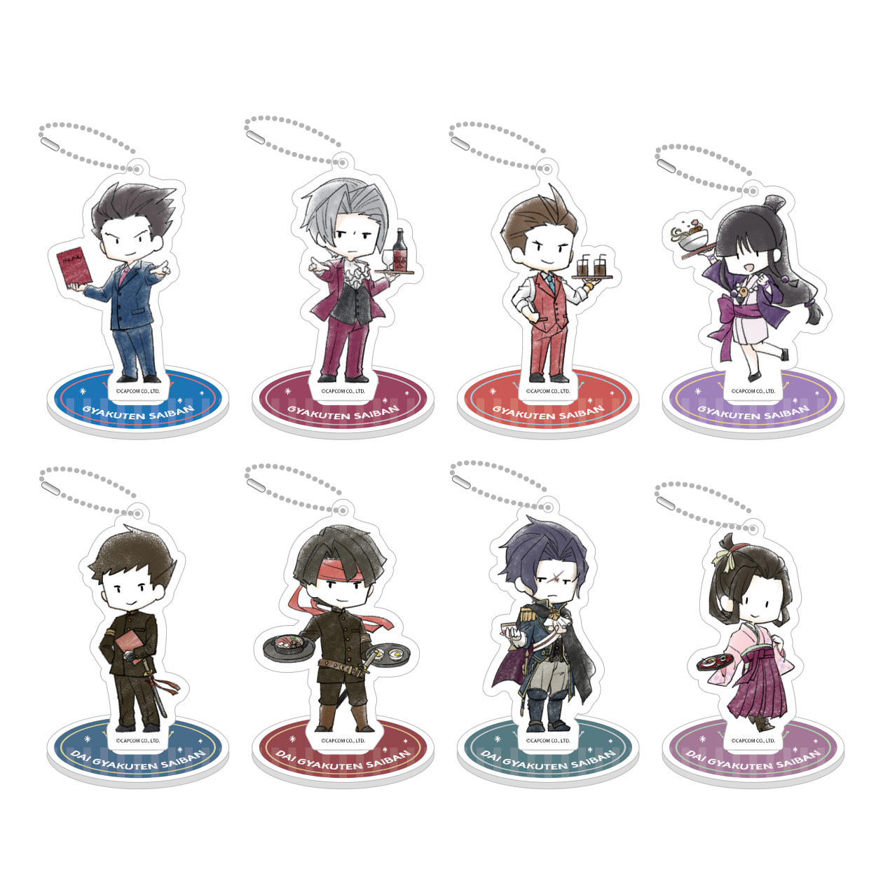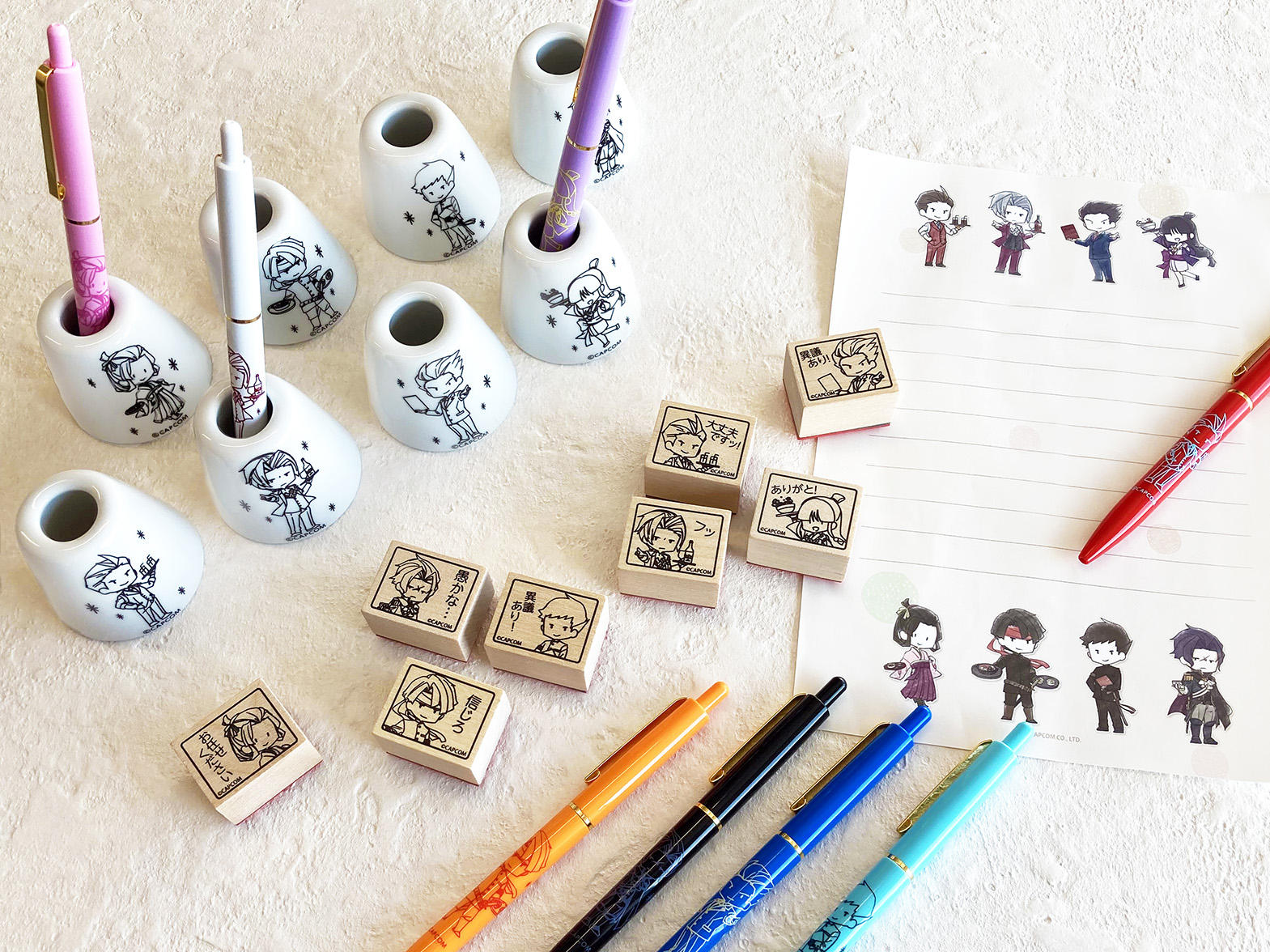 『逆転裁判』からは成歩堂 龍一、御剣 怜侍、王泥喜 法介、綾里 真宵、『大逆転裁判』からは成歩堂 龍ノ介、亜双義 一真、バロック・バンジークス、御琴羽 寿沙都の可愛いデフォルメ描き下ろしイラストを使用した「アクリルスタンド」、「ワッペン風ステッカー」、「缶バッジ」などのトレーディングアイテムをはじめ、日常生活で楽しめる「ペンスタンド」、「ボールペン」、「レターセット」、「スタンプセット」などのステーショナリーアイテムを多数ご用意致しました。