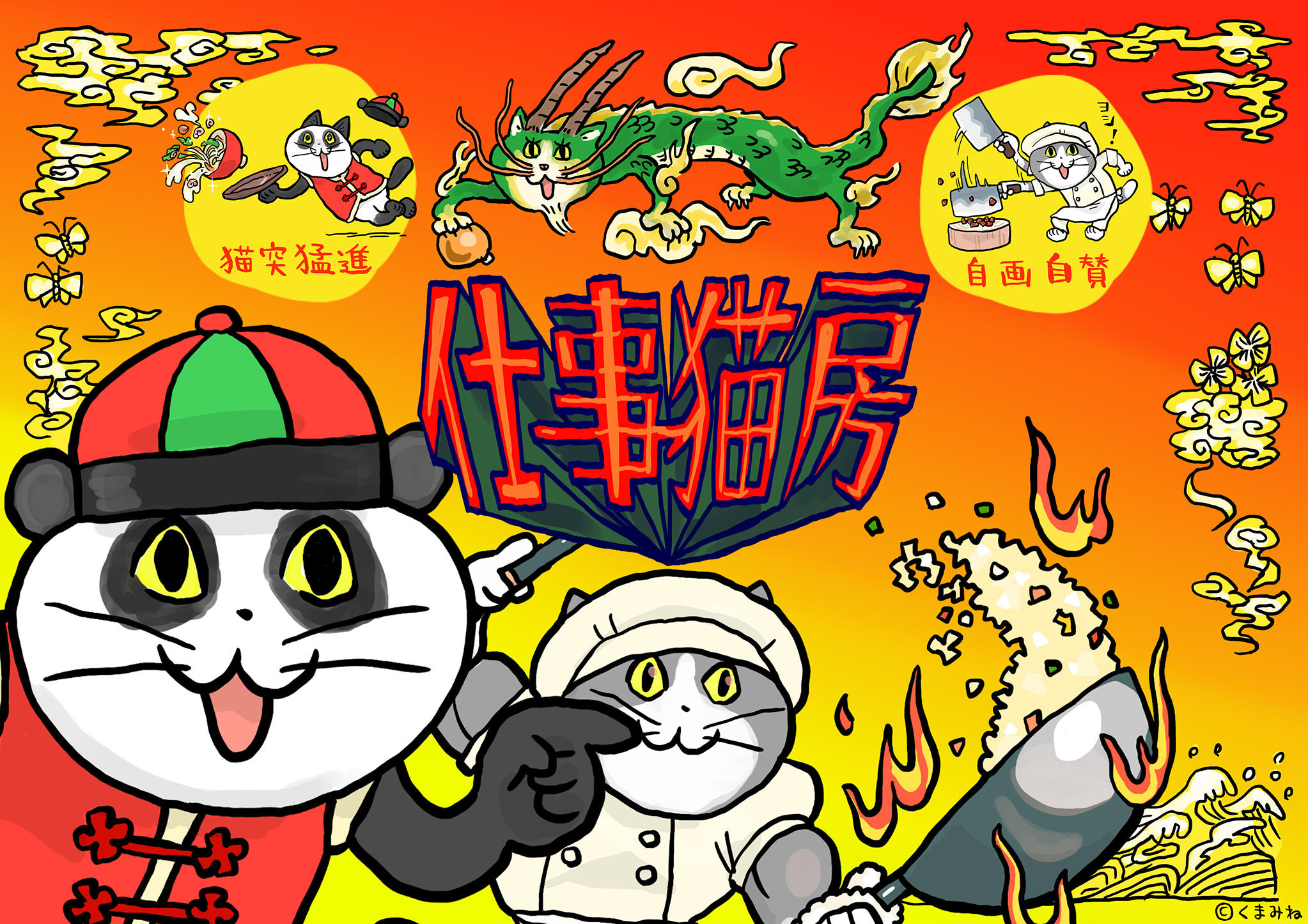「仕事猫房」という中華料理店で、仕事猫が料理を用意する姿が描かれた可愛らしいイラストとなっています。