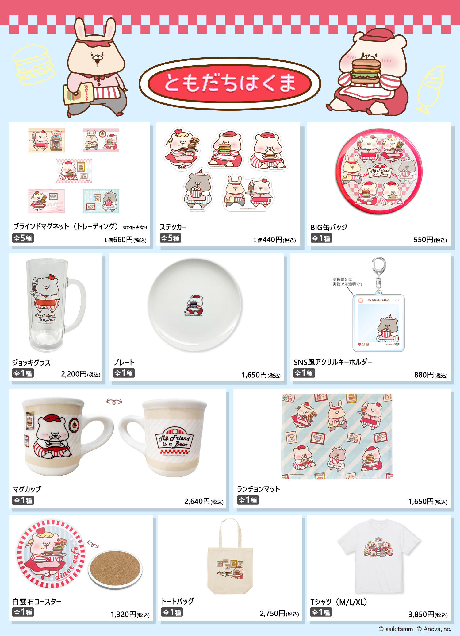 食いしん坊でちょっと残念なくま、餅の様なほっぺたとぽっちゃりボディがチャームポイントの若い女性を中心に人気急上昇中のキャラクター「ともだちはくま」とのアメリカンダイナー風コラボレーショングッズです!