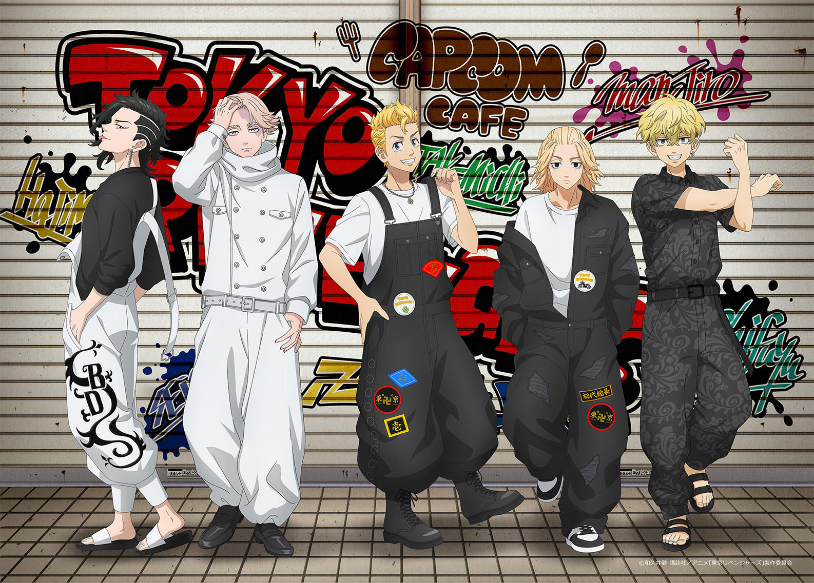 今回のメインビジュアルでは、タケミチ、マイキー、千冬、イヌピー、ココの5人がおしゃれなストリートファッション姿で登場!各キャラクター、そしてカプコンカフェのロゴが施されたグラフィティアートも必見!