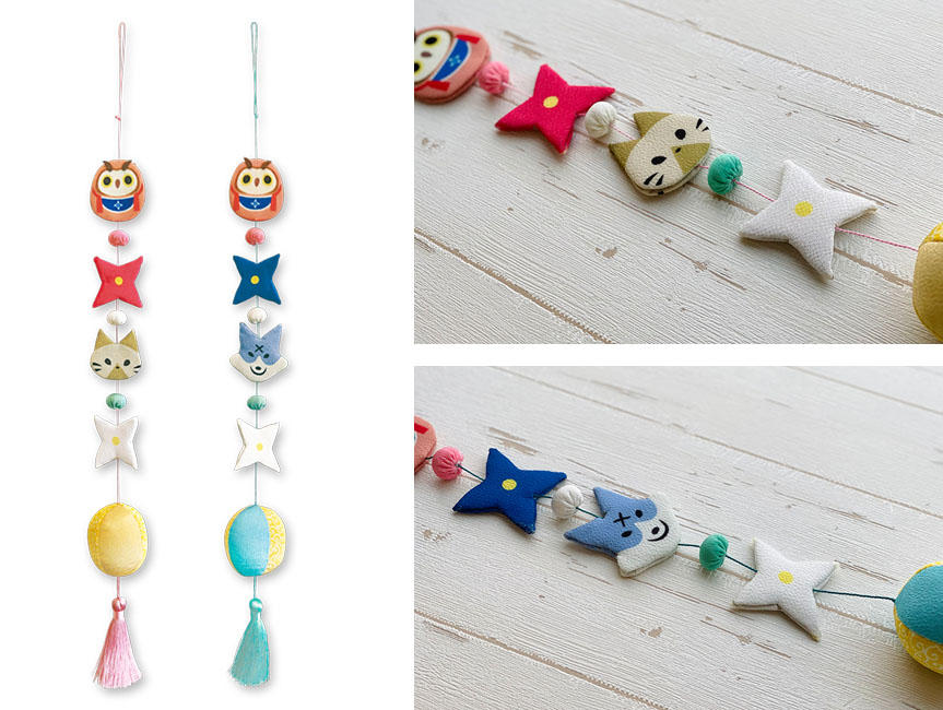 今回『モンスターハンターライズ』の世界観のイメージから、ちりめん素材を使用した「つるし飾り」がアイルーとガルクの2種で登場! 三色団子や手裏剣などの作中に登場するモチーフもちりばめられており、一本吊りとしても、二本連ねて飾っても楽しめるデザインとなっております。