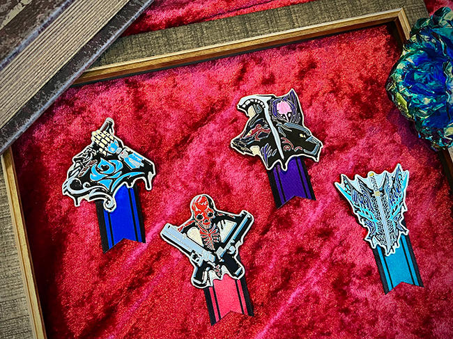 『デビル メイ クライ 5』作中でのお馴染みの、各キャラクターを象徴したエンブレムデザインのブローチが登場。