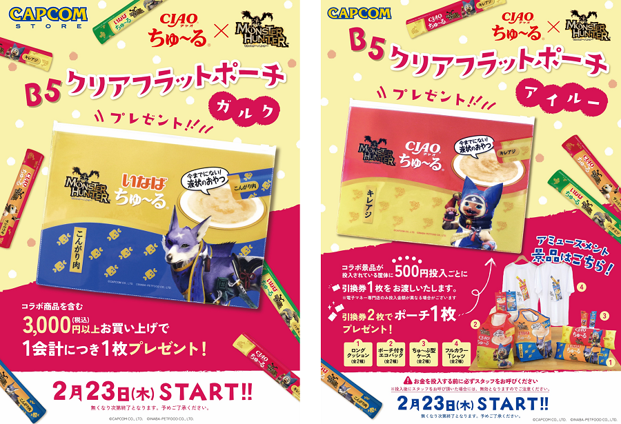 株式会社カプコンは、2023年2月22日の「猫の日」を記念し、『モンスターハンター』シリーズと『いなばCIAOちゅ~る』の異色のコラボレーション商品をカプコン直営店舗にて順次販売いたします。