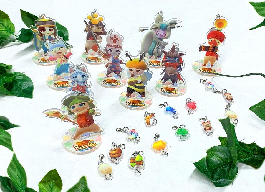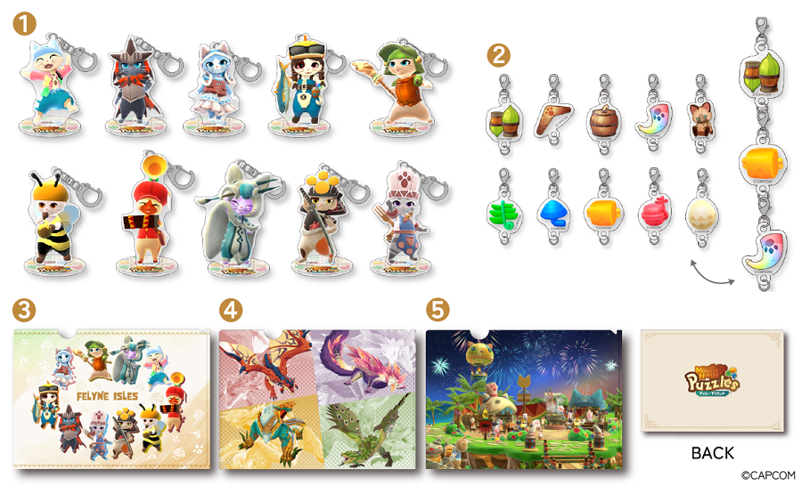 様々な衣装をまとったアイルーたちの「アクリルスタンドキーホルダー」、作中に登場するアイコンをつなげてカスタマイズできる「連結キーホルダー」、さらには「モンスターハンター」シリーズでおなじみのモンスター等がデザインされた「クリアファイル」の3商品を今回ご用意しました。