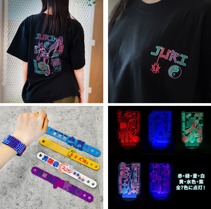 ネオンアートが大胆に再現された「刺繍Tシャツ」や「ラバーバンド」、「アクリルキーホルダー」、「ステッカー」など日常や大会の応援グッズとして身に着けられるファッションアイテムをはじめ、ゲームを遊ぶ時に使える「デスクマット」や7色に色が変化する「LEDライト」といった、お部屋もネオン色に染められるアイテムもご用意いたしました。