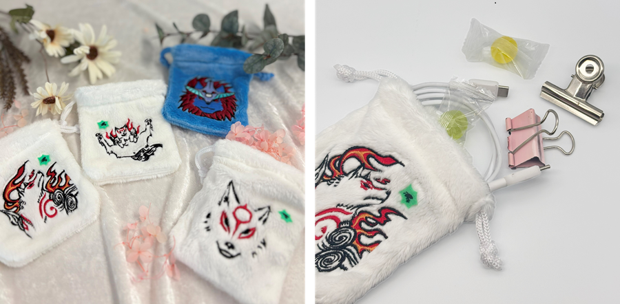 この世のぬくもりが、巾着に蘇る! 「大神」シリーズより、「アマテラス」「オキクルミ」の刺繍入りふわふわ巾着が新登場!