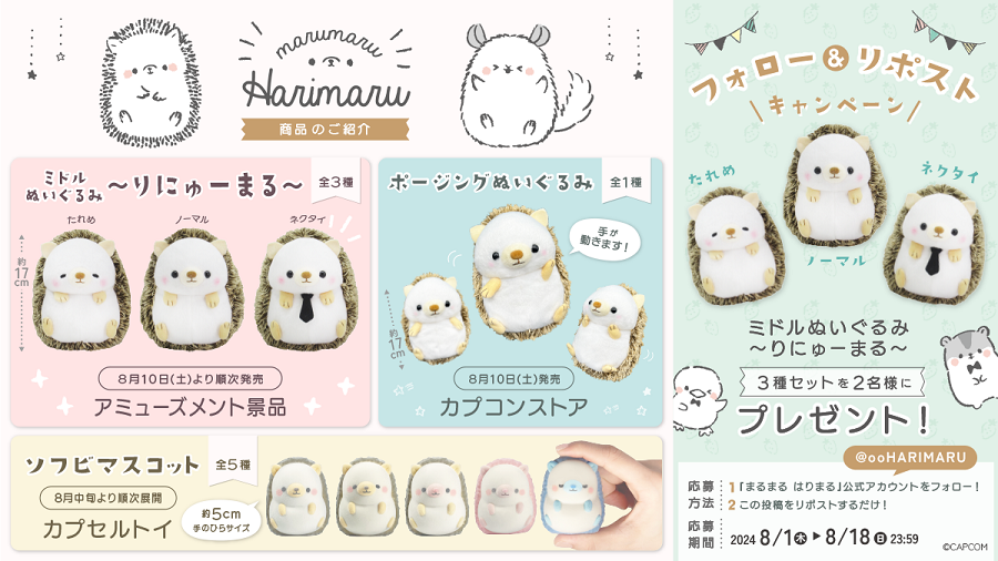 アミューズメント景品「ミドルぬいぐるみ ~りにゅーまる~」とカプコンストア商品「ポージングぬいぐるみ」、カプセルトイ商品「ソフビマスコット」の登場を記念して、「ミドルぬいぐるみ ~りにゅーまる~」が当たるキャンペーンを開催いたします!
