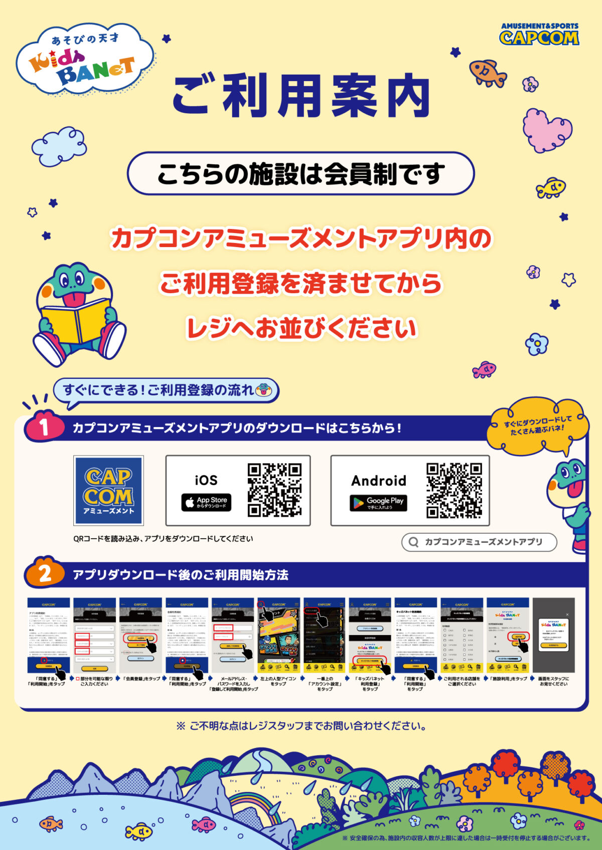 キッズバネットは会員制施設のため、ご利用には「カプコンアミューズメントアプリ」内のご利用登録が必要です。事前登録を行うことで、ご来店いただいた際の受付時間がスムーズになります。ぜひ、ご来店前にご登録をお願いいたします。