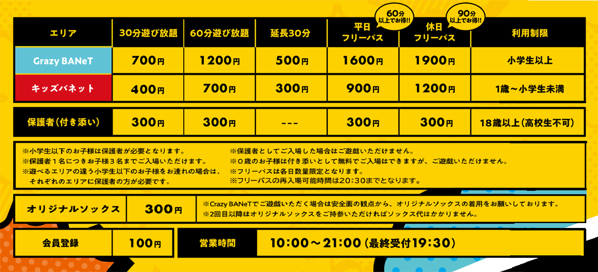 Crazy BANeTは時間制の施設です。料金は利用プランにより異なります。