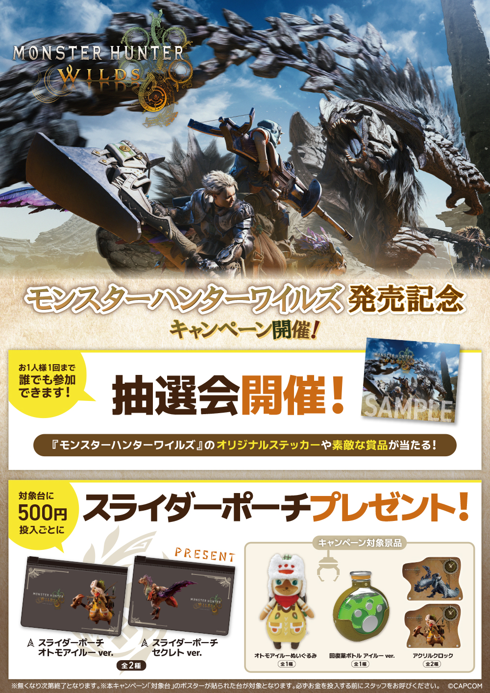 『モンスターハンターワイルズ』のオリジナルステッカーなどが当たる抽選会をカプコンのアミューズメント店舗