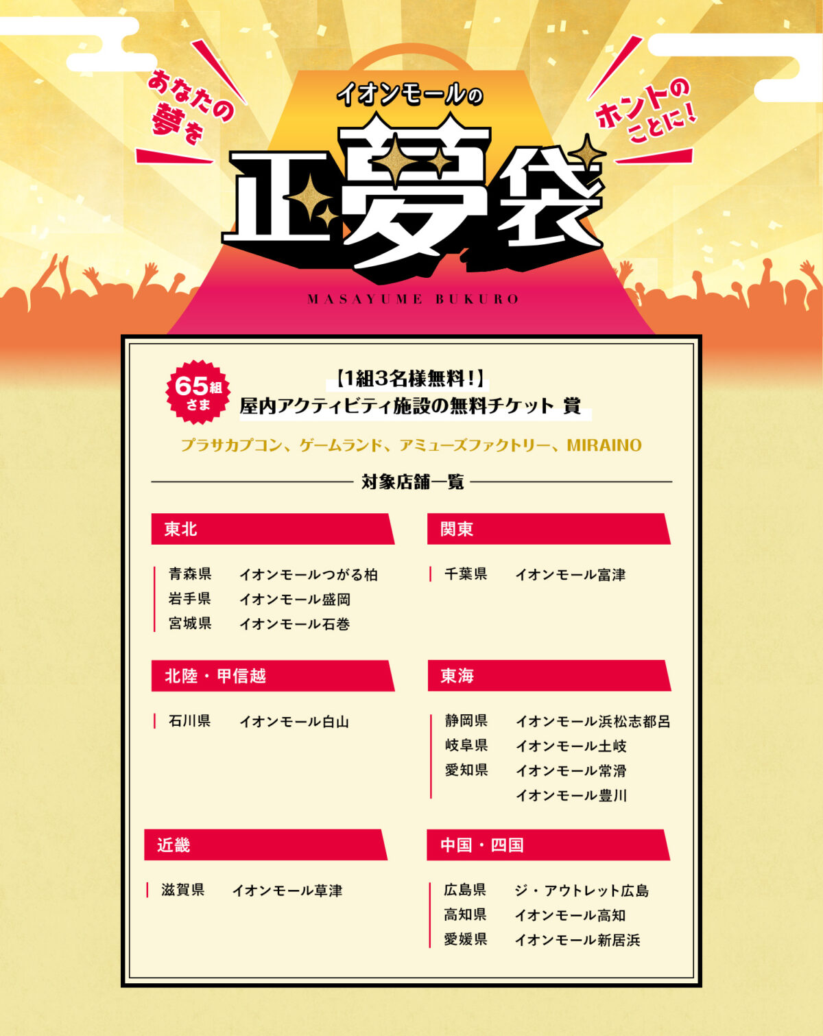 株式会社カプコンは、2026年度「イオンモールの正夢袋」企画にて、カプコンが運営する「あそび王国 ぴぃかぁぶぅ」「Crazy BANeT(クレイジーバネット)」「KidsBANeT(キッズバネット)」等のキッズコーナー・屋内遊具施設に、1組3名様まで無料でご入場いただけるチケットを抽選で65組様にプレゼントいたします。