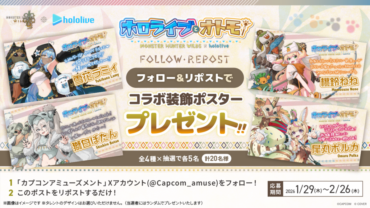 ・厳正な抽選の上、当選者様にはキャンペーン終了後に「カプコンアミューズメント(@Capcom_amuse)」より、1ヶ月以内にダイレクトメッセージをお送りします。