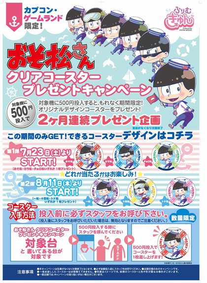 2016年7月23日(土)から2ヶ月連続で、対象となるプライズ機に500円を投入していただくとカプコン限定の『おそ松さん ふりむきゅんマリンスタイル クリアコースター』をもれなくプレゼントいたします。
