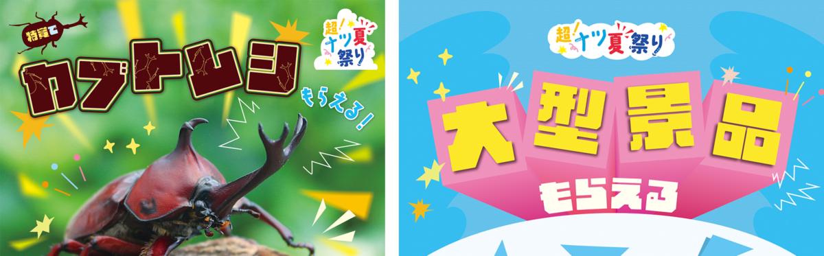 特賞でカブトムシ(虫かご付き)や大型景品などが当たるイベントにご参加いただけます