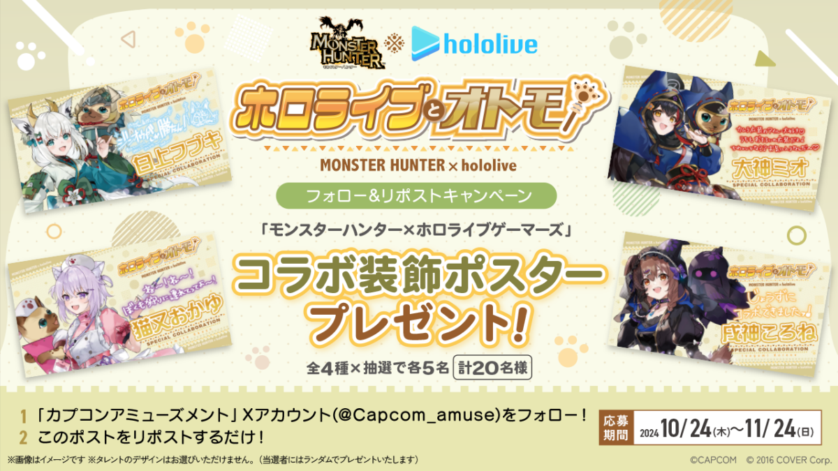 ・厳正な抽選の上、当選者様にはキャンペーン終了後に「カプコンアミューズメントX(旧Twitter)アカウント(@Capcom_amuse)」より、1ヶ月以内にダイレクトメッセージをお送りします。