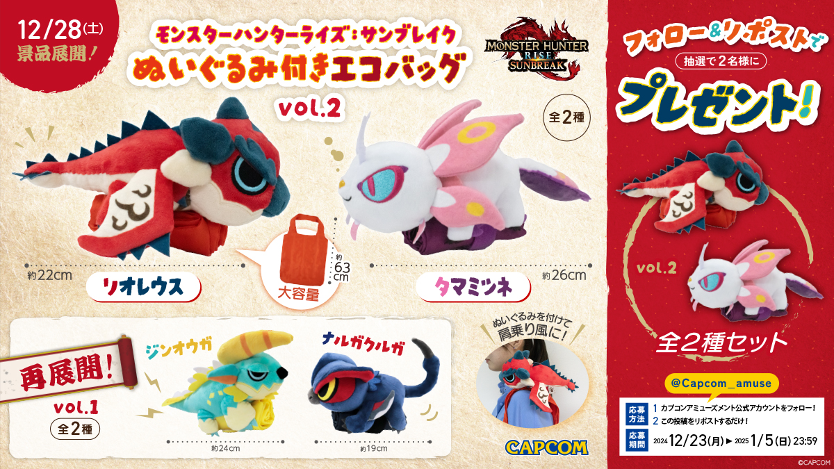 『モンスターハンターライズ:サンブレイク』追加コンテンツ重ね着武器シリーズより、「リオレウス」「タマミツネ」がぬいぐるみ付きの「エコバッグ」になってカプコン直営アミューズメント店舗に新登場!