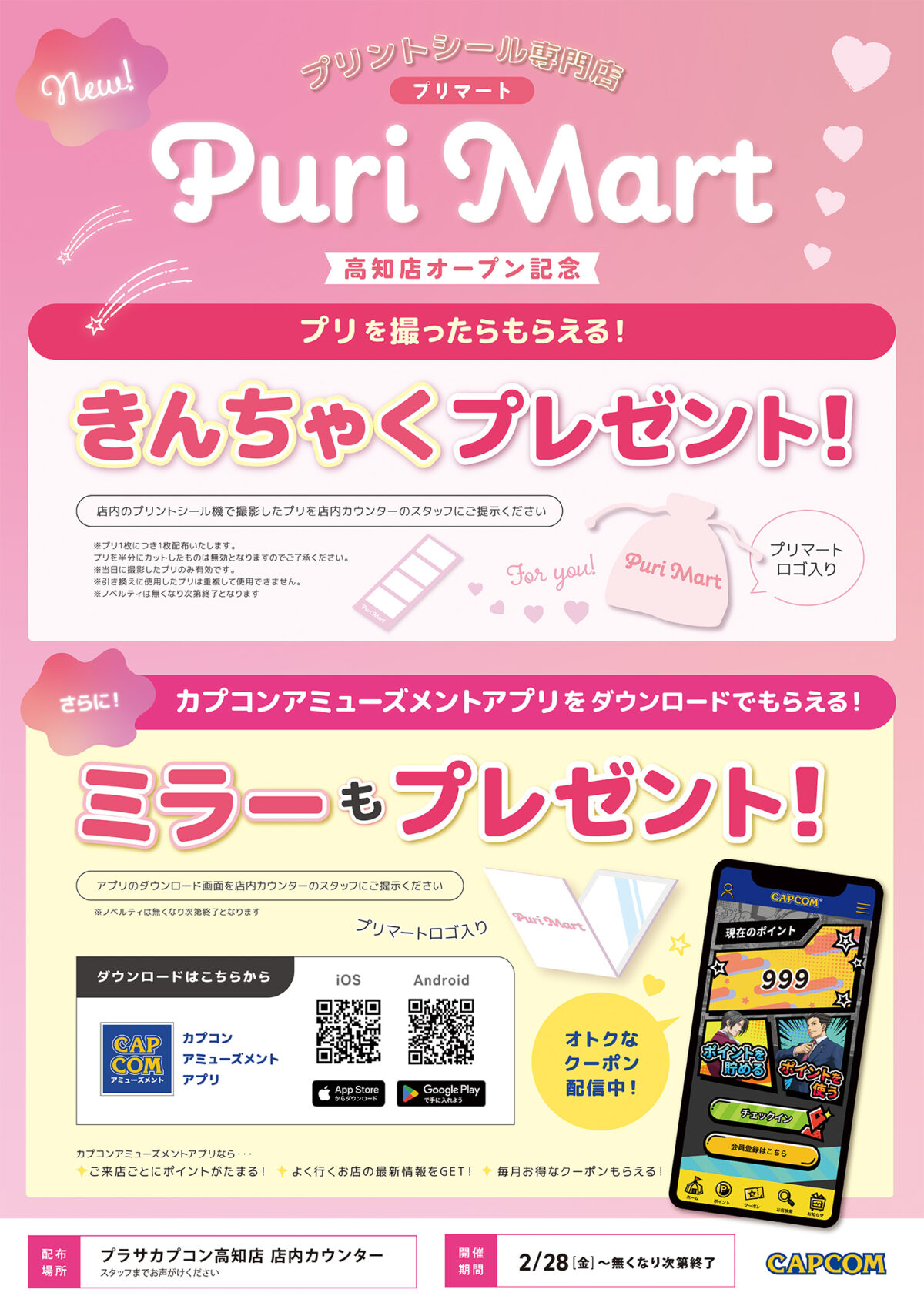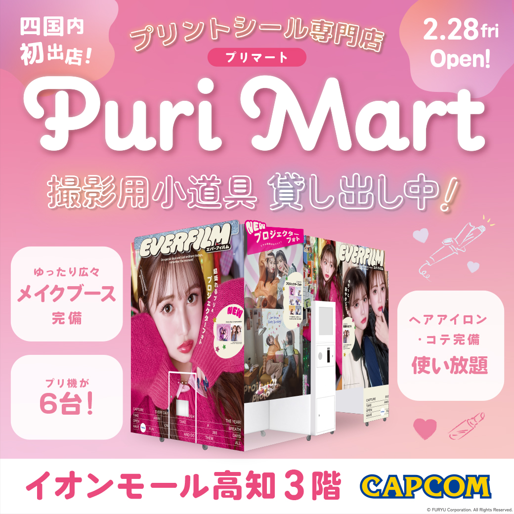 株式会社カプコンは、高知県高知市にあるショッピングモール「イオンモール高知」に、”かわいい”が溢れたプリントシール機コーナー「Puri Mart(プリマート)」を2025年2月28日(金)にオープンいたします。