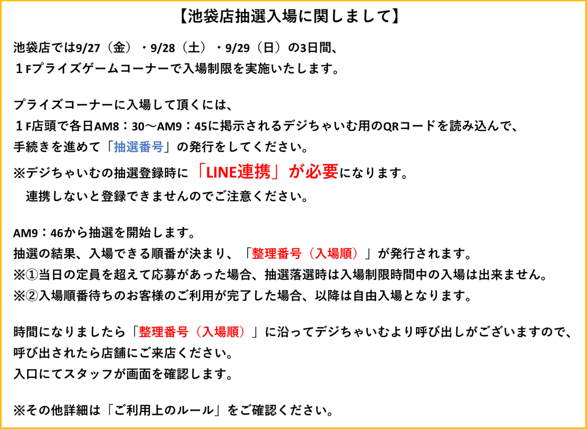 ※「抽選番号」と「整理番号(入場順)」は別のものとなりますので、ご注意下さい。(ただし、偶然一致する場合もございます)