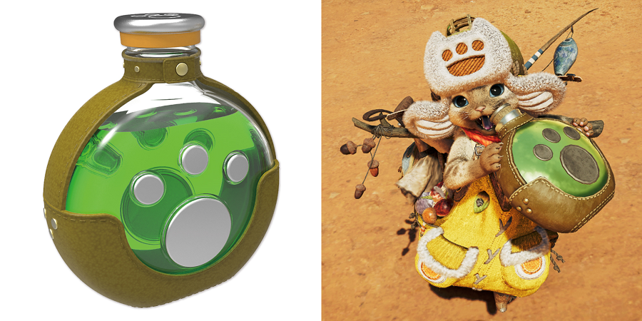 ゲーム内で「オトモアイルー」が愛用する回復薬ボトルが、『モンスターハンターワイルズ』パッケージになってカプコンのアミューズメント店舗に再登場。飾って楽しむだけでなく、飲料ボトルとしても使用できるスグレモノです。