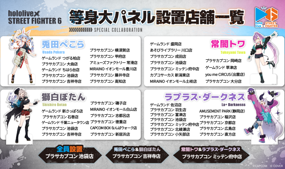 コラボ開始に合わせて、各店舗にて「ストリートファイター6×ホロライブ」のクレーンゲームが登場! さらに「プラサカプコン 池袋店」ではスペシャルコラボ店舗として特別装飾も展開。さらに等身大パネルも設置いたします。