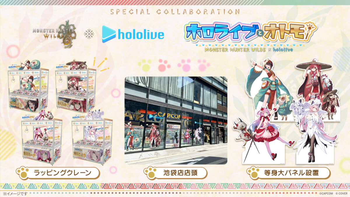 コラボ開始に合わせて、各店舗にて「モンスターハンターワイルズ×ホロライブ」コラボ第2弾のクレーンゲームが登場! さらに「プラサカプコン 池袋店」ではスペシャルコラボ店舗として特別装飾も展開。さらに等身大パネルも設置いたします。