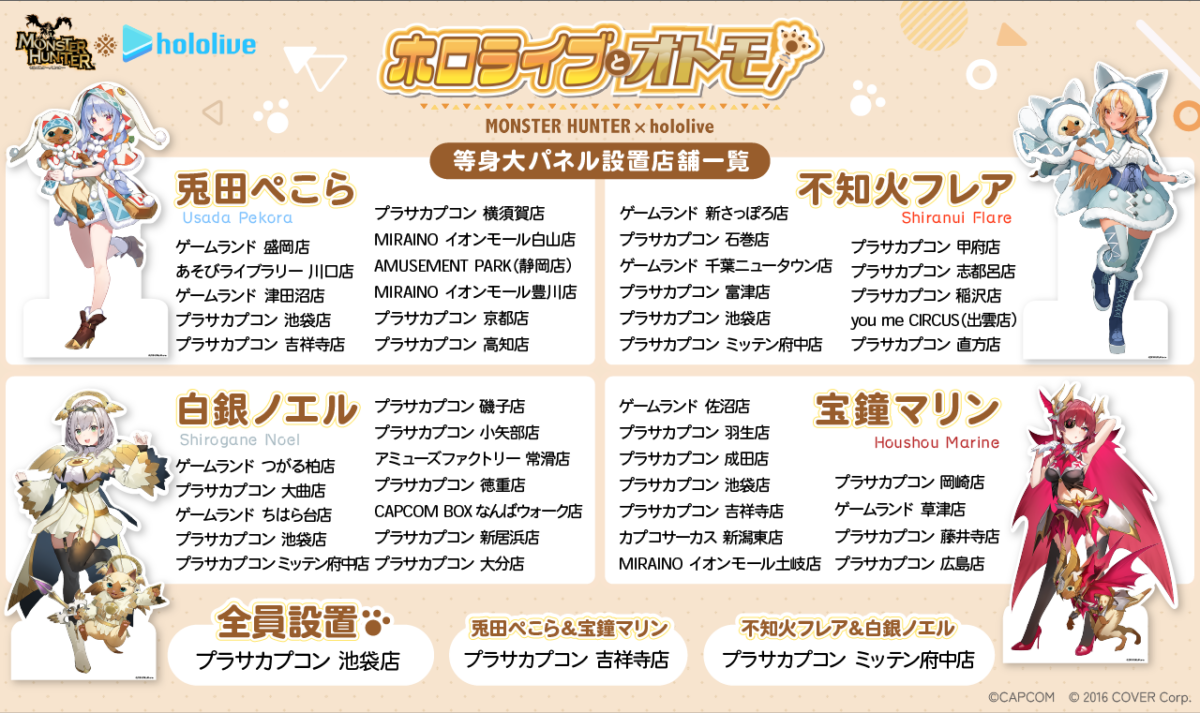 株式会社カプコンが運営するアミューズメント施設において、カバー株式会社(本社:東京都港区、代表取締役社長:谷郷元昭)が運営する「ホロライブプロダクション」傘下の女性VTuberグループ「ホロライブ」の3期生所属VTuber「兎田ぺこら」「不知火フレア」「白銀ノエル」「宝鐘マリン」とのコラボレーションが決定いたしました。