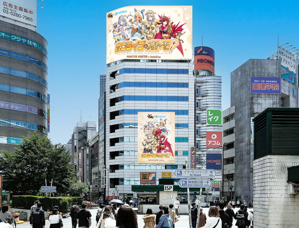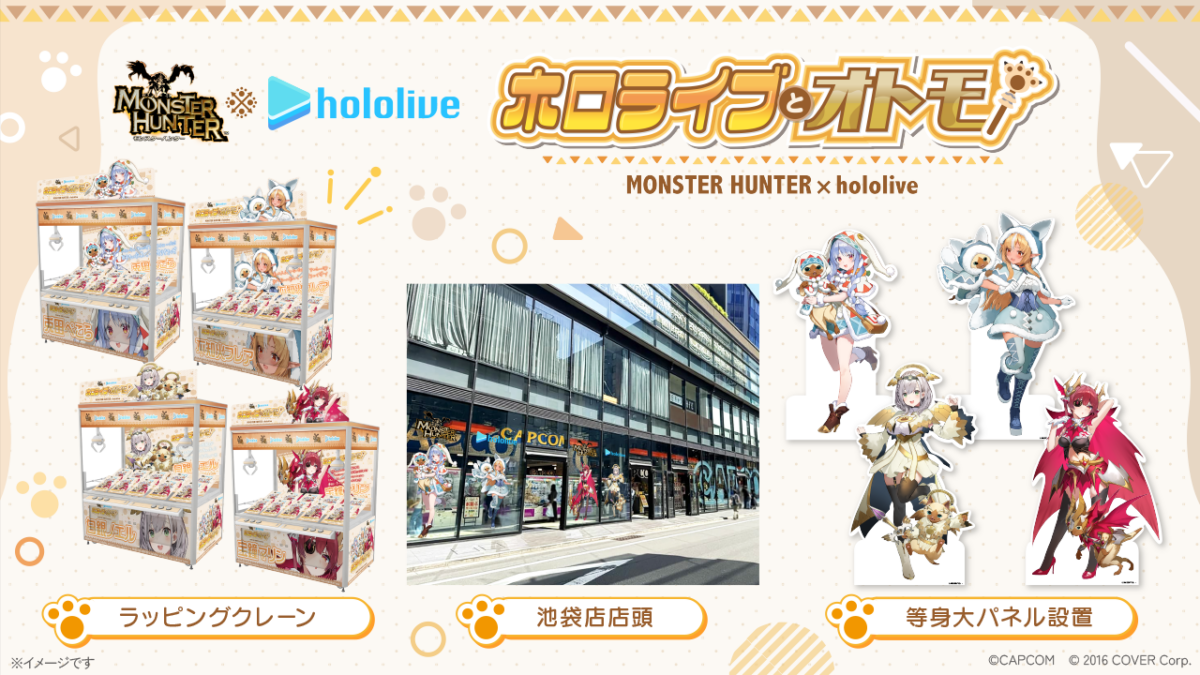 さらに「プラサカプコン 池袋店」ではスペシャルコラボ店舗として「モンスターハンター×ホロライブ3期生」のウィンドウ装飾を展開。さらに3期生の方々による等身大パネルも設置いたします。