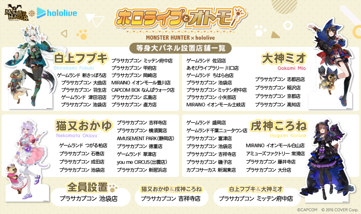 株式会社カプコンが運営するアミューズメント施設において、カバー株式会社(本社:東京都港区、代表取締役社長:谷郷元昭)が運営する「ホロライブプロダクション」傘下の女性VTuberグループ「ホロライブ」のゲーマーズ所属VTuber「白上フブキ」「大神ミオ」「猫又おかゆ」「戌神ころね」とのコラボレーションが決定いたしました。