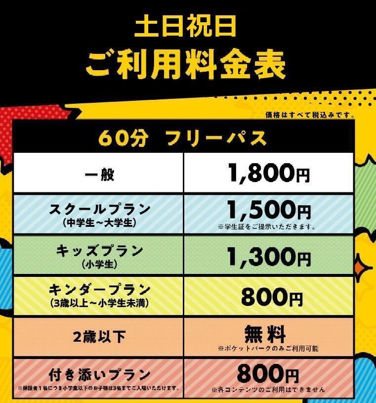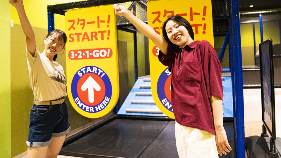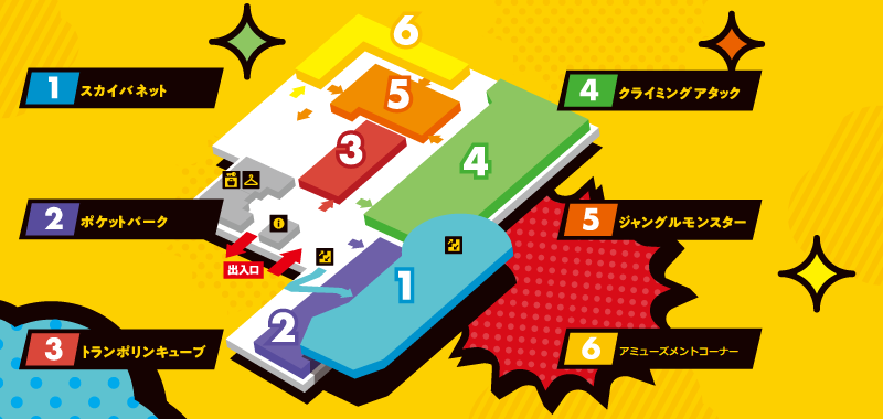 フロアマップ「スカイバネット」・「ポケットパーク」・「トランポリンキューブ」・「クライミングアタック」・「ジャングルモンスター」・「アミューズメントコーナー」の6エリアから構成された大型フィジカルアクティビティ施設です。