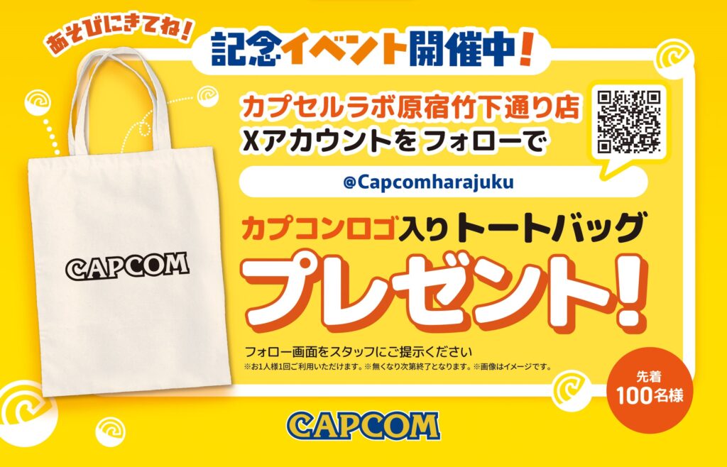 ・実施内容 :カプセルラボ 原宿竹下通り店公式Xアカウント(@Capcomharajuku)のフォロー画面ご提示で先着100名様に「カプコンロゴ入りトートバッグ」をプレゼント!