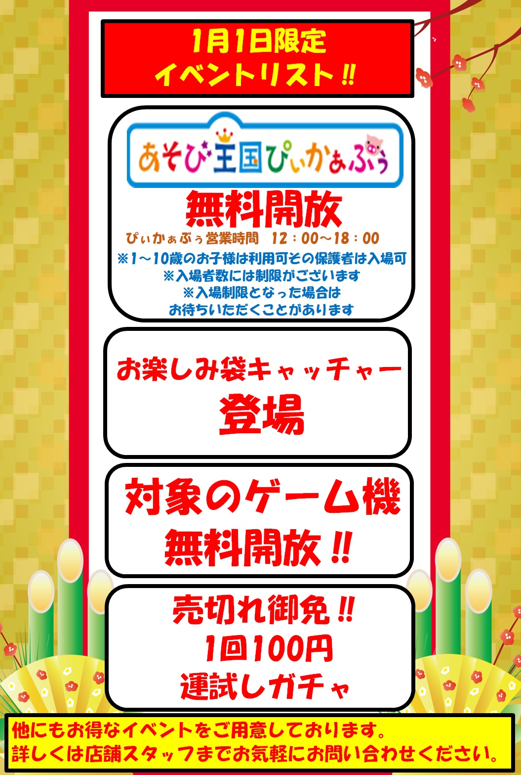 1月1日 11:00~20:00 (あそび王国ぴぃかぁぶぅのみ 12:00~18:00)