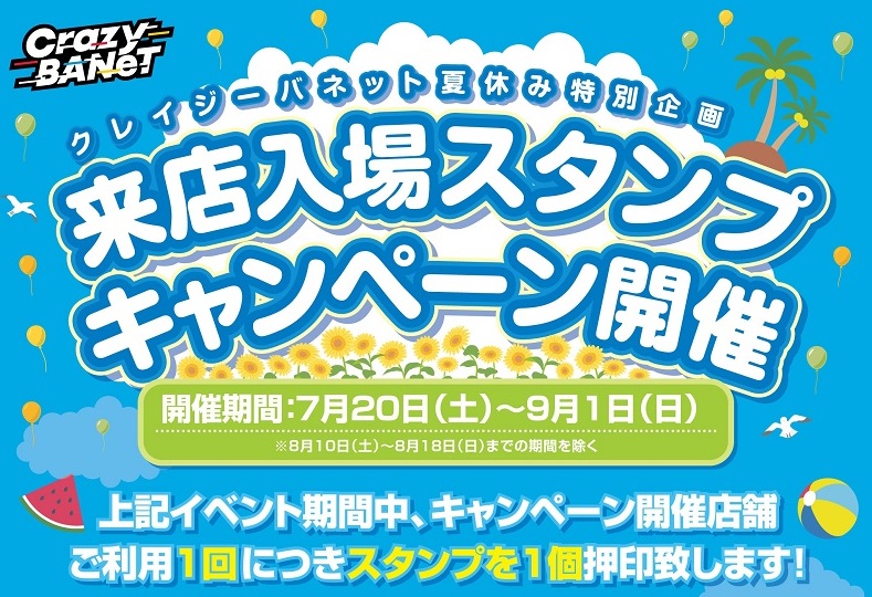 「Crazy BANeT 新居浜店」では、2024年7月20日(土)~2024年9月1日(日)(※一部期間を除く)の期間中、来店入場ごとにスタンプがたまるスタンプカードを配布いたします。