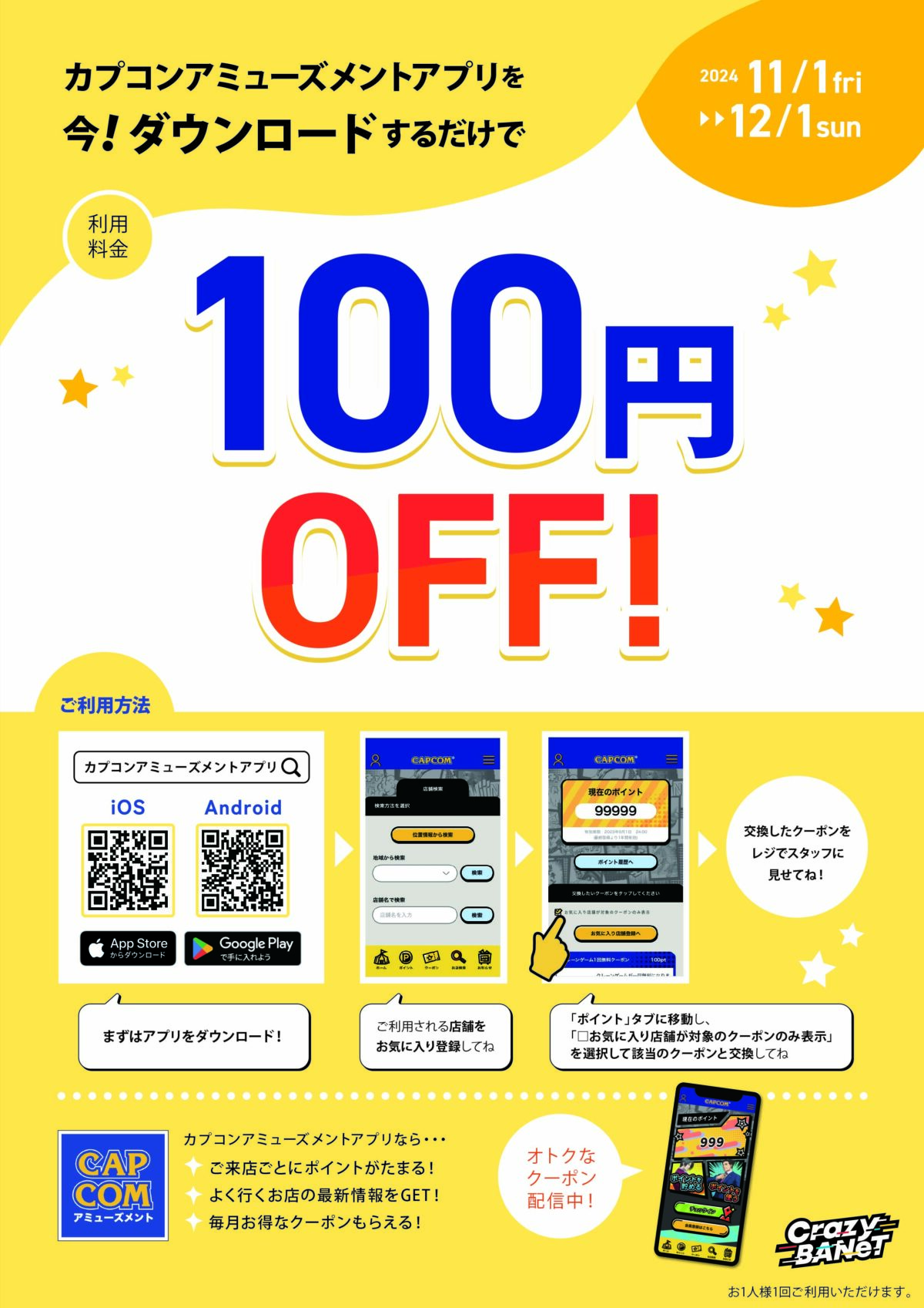 「Crazy BANeT 新居浜店」では、2024年11月1日(金)~2024年12月1日(日)の期間中、「カプコンアミューズメントアプリ」ダウンロードでご利用料金が100円引きになるキャンペーンを開催いたします!