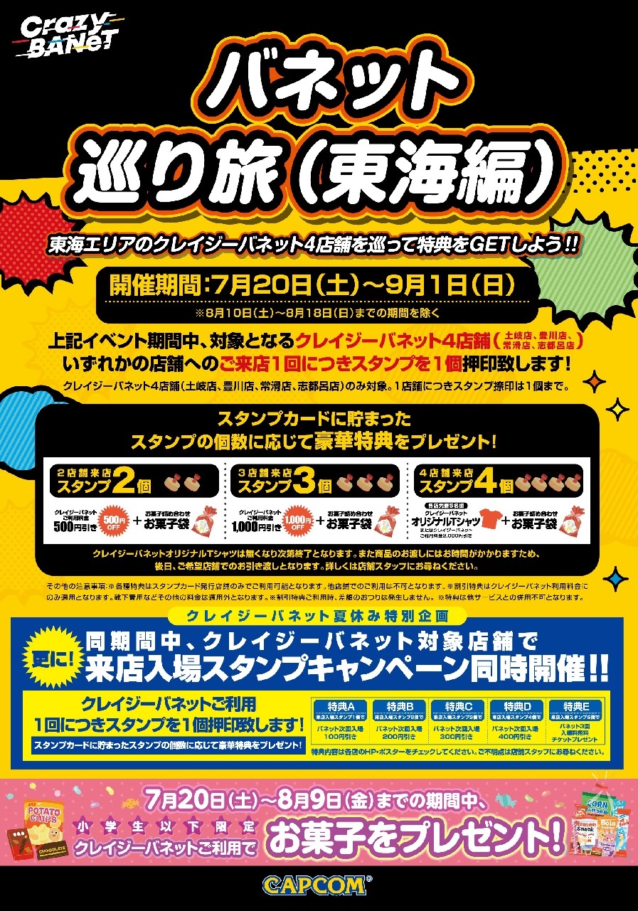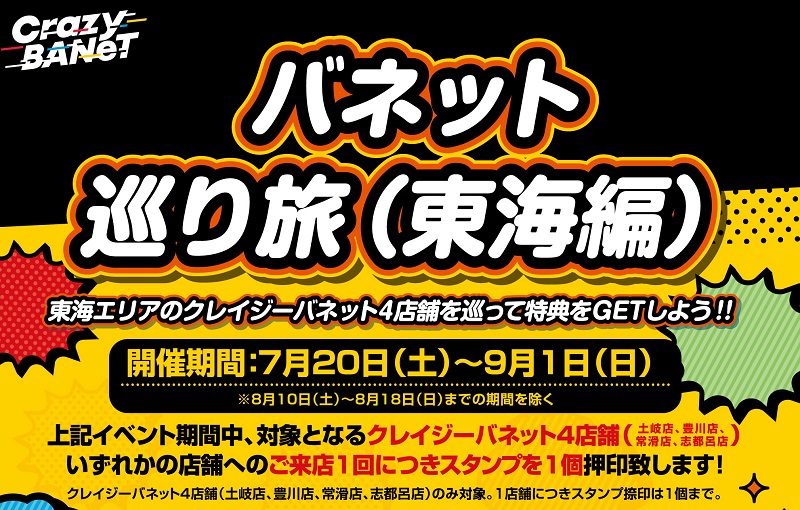 「Crazy BANeT 志都呂店」では、2024年7月20日(土)~2024年9月1日(日)(※一部期間を除く)の期間中、東海エリアのCrazy BANeT店舗限定で「巡り旅」キャンペーンを開催いたします!