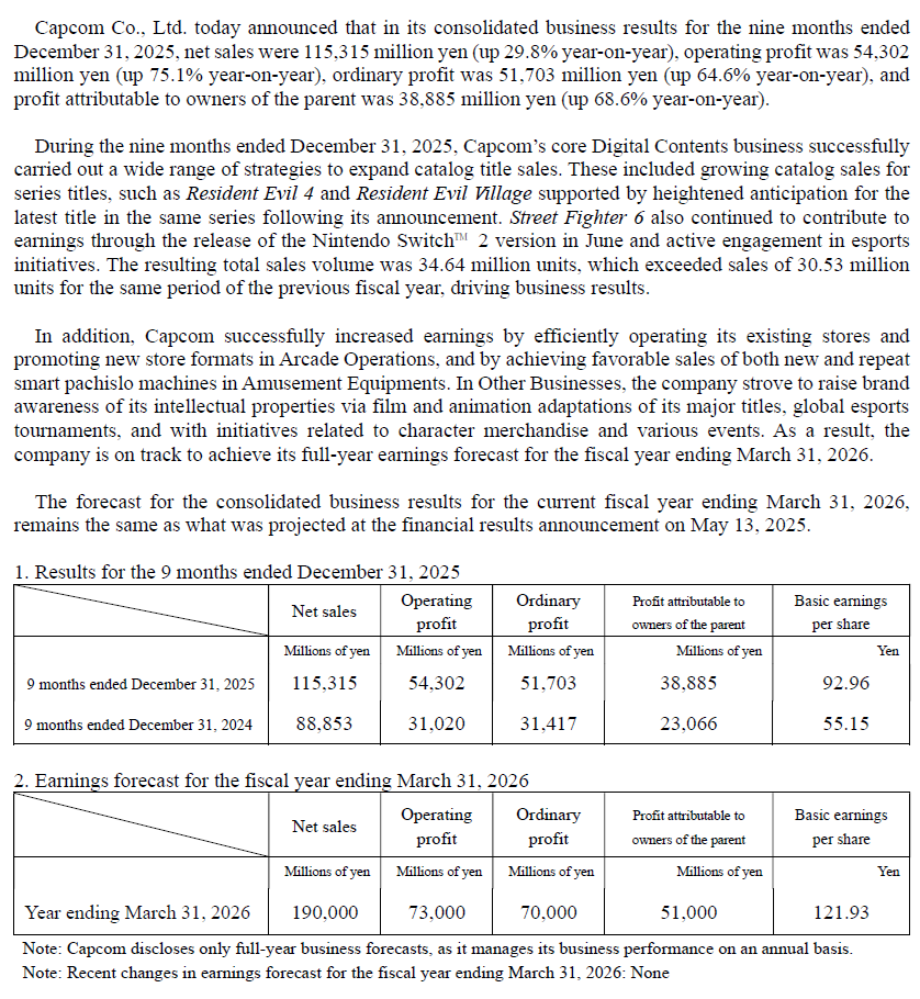 Capcom’s Consolidated Results for the Nine Months Ended December 31, 2025