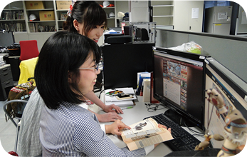 企画職として『モンスターハンター3G』および『モンスターハンター4』に携わり、現在は、新規プロジェクトのストーリーや台詞を作成する「進行」と村やショップの内容を設定する「施設」の2つのユニット(約15名)を統括するリーダーに指名され、スタッフのスケジュール管理や他職種との調整等も行っています。
