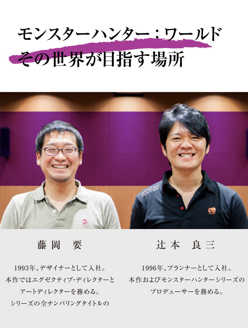 「実際にプレイしていただければ、間違いなくこれはモンスターハンターだ! と思えるものになっています。本作からプレイし始める方にとっては、これまでに味わったことのない新しい世界を体験していただける自信があります(辻本)」。