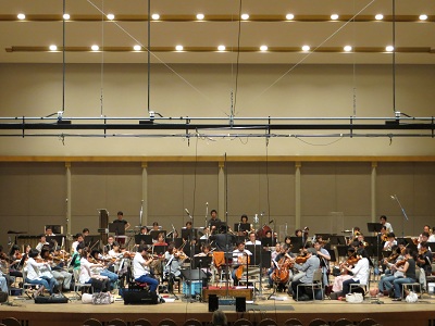 - ホールでの収録はホール特有の響きと言いますか、色んな楽器が一つの場所で一斉に演奏するのでその力強さと、全体を包み込むような優しい響きを合わせ持っていると個人的に思っているのですが、今作は力強い楽曲が多いのもあり、刺々しい力強さではなく温かみのある力強さが欲しかったとうのがホールで収録した大きな理由の一つです。 あともう一つは編成が大きいのもありまして日本のスタジオでは入りきらなかったというのもありますね。 オーケストラの収録風景
