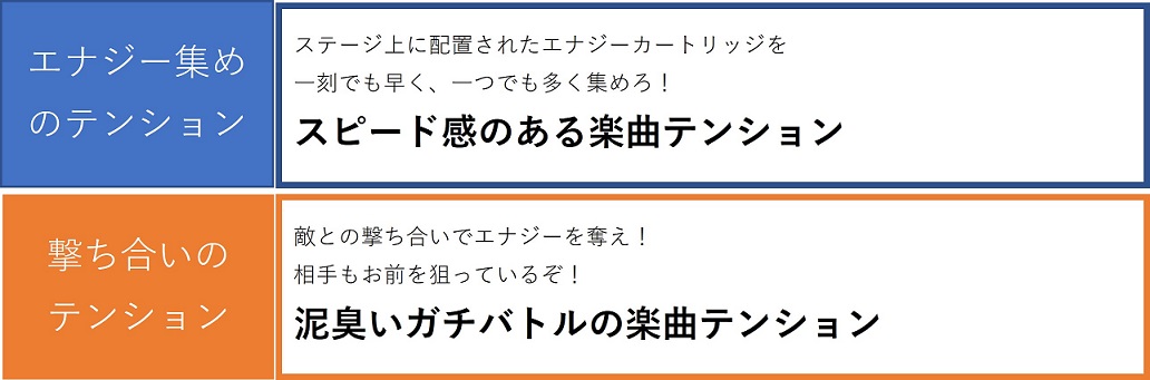 - 「エナジーテイカー」は相手よりも多くのエナジーを取得した方が勝つというルールですが、相手チームのプレイヤーを倒すことでエナジーを奪うこともできます。 つまり、せっせとエナジーを集めるテンションと、敵プレイヤーとの激しい撃ち合いになるテンションとが混ざり合ったルールなのです。 森本さんと相談しつつ、音楽でもそのルールの二面性をアレンジで表現することにしました。