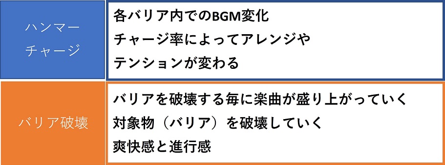 - 楽曲的な変化としては2つありまして、ハンマーへのチャージ率がしっかり感じられる縦軸での楽曲変化と、