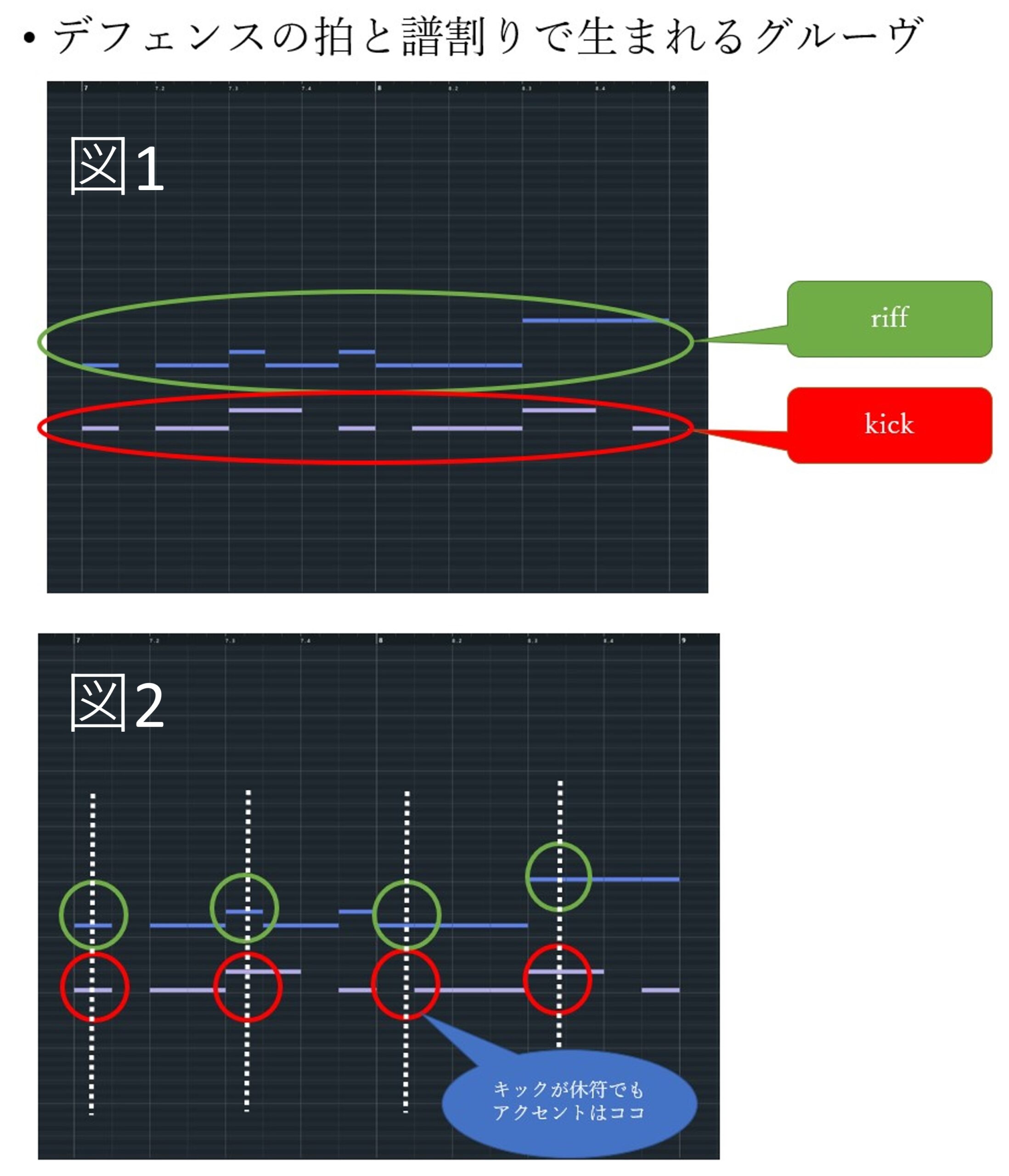 まず8beatが基準となっており、ゆったりと大きなかたまりになっているのが図1でわかると思います。リフとリズムがほぼ同じアクセントを持っており、 シンコペーションしたとしても裏拍にアクセントが移ることなく、表にアクセントが来ています。 また、図2の白い点線のように、縦のリズム、リズムが垂直になっているのがお分かりかと思います。
