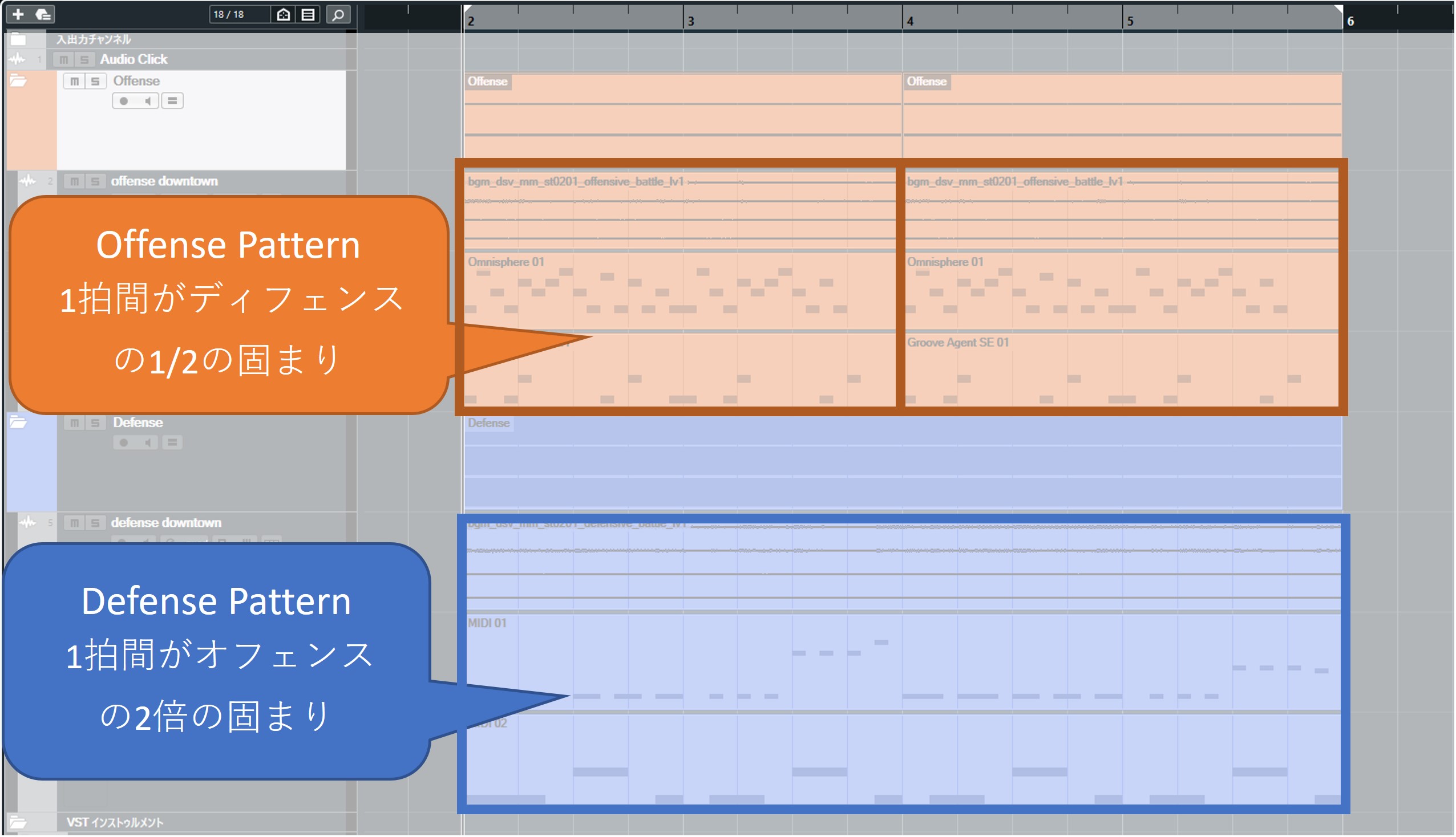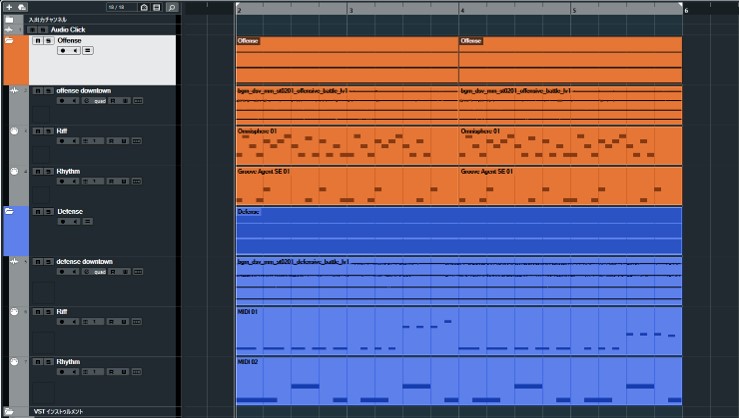 - このように、オフェンス・ディフェンスでは“分厚さ”や“派手さ”を変えるのではなく、”ノリ“を変えることでそれぞれのゲーム性や、フィールを音楽で伝えようとしています。