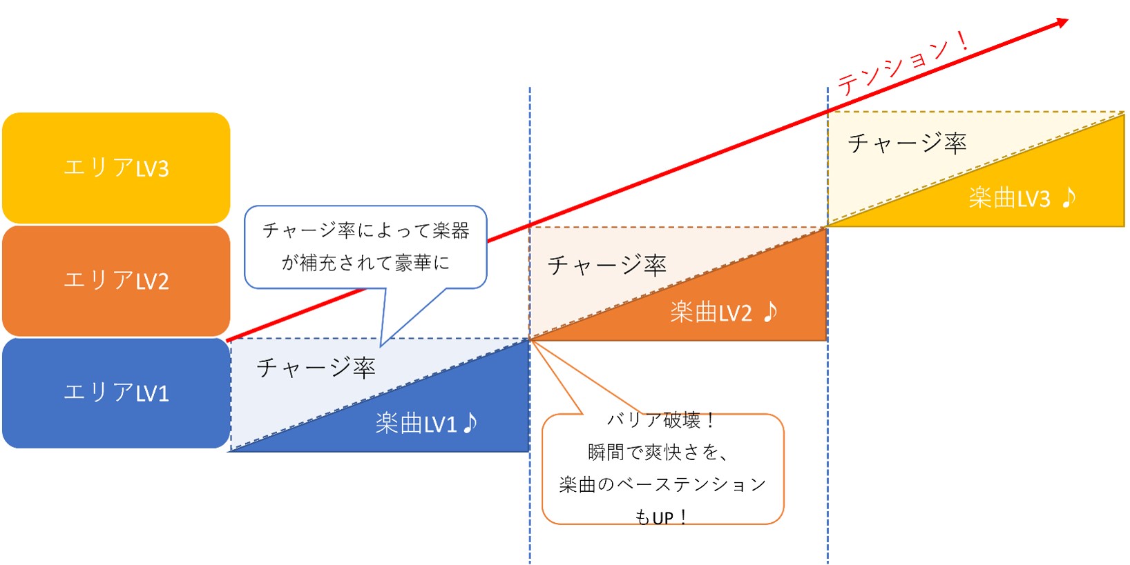 バリアを破壊しエリアの切り替わりごとに曲が盛り上がっていくという横軸での楽曲変化を設けています。