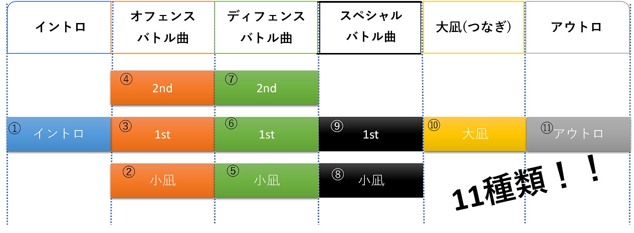1st/2ndミッションの中にはフェーズと呼ぶ区切りがあり、これらで1セットとなります。前半ミッション(ファイナルミッション以外)では始めから終わりまで「1曲」として捉えつつ、ゲームルールやプレイヤーが置かれている状況にあわせて 楽曲アレンジが変化していく仕様にしています。 バトル曲のアレンジは当該ステージのゲームルールの性質によって 「オフェンス系」「ディフェンス系」「スペシャル系」の3種類に分類され、抽選されるミッション次第で楽曲アレンジの組み合わせが変わっていくようになっています。