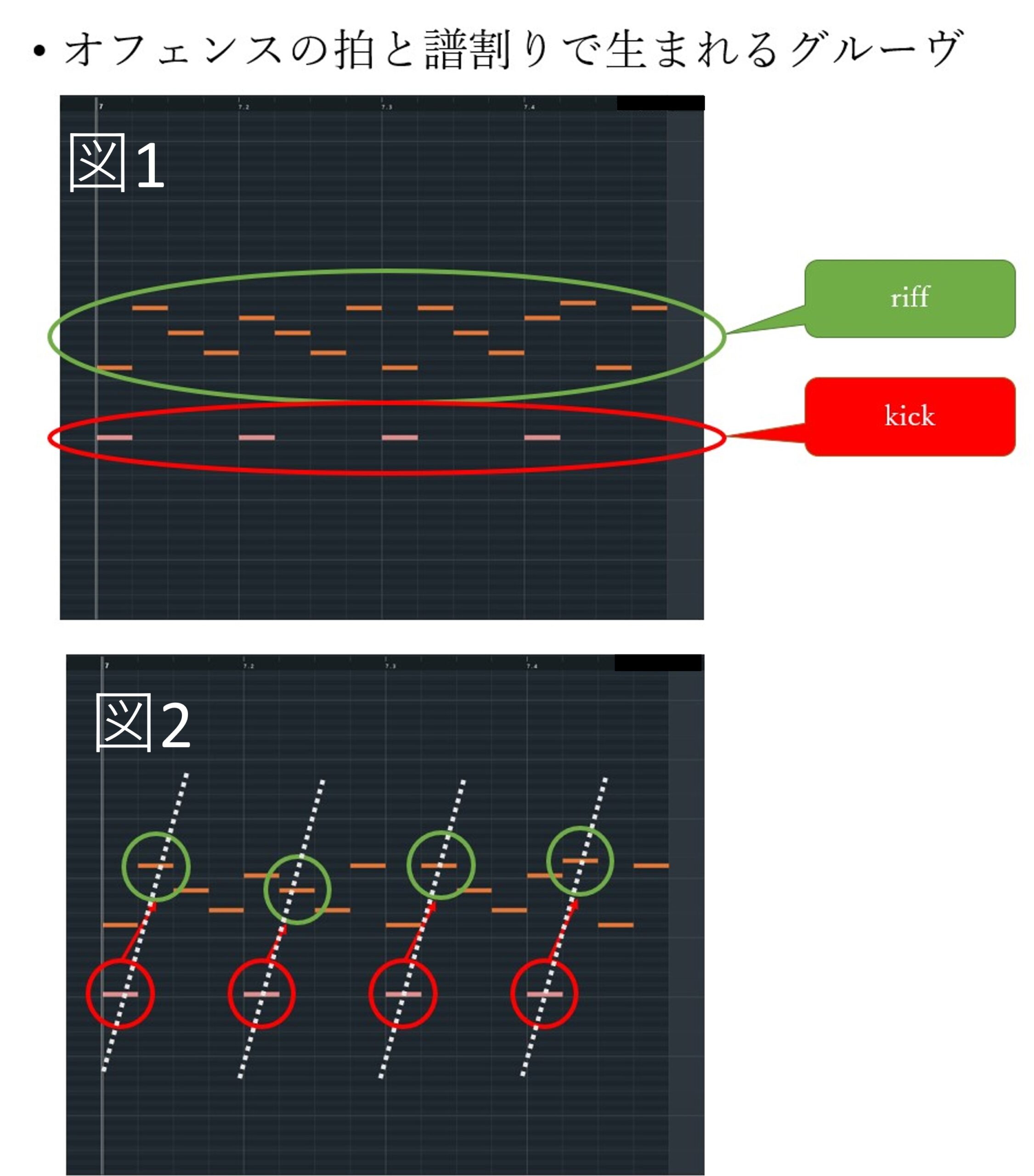 図1赤枠部、キックが4つ打ちなので頭にアクセントが来ているように思うのですが、すぐ後に16分のリフ(緑枠の部分)が顔を出すため、 図2のように双方が合わさると裏拍アクセントになるリズムが、横に流れ、白い点線のように、前のめりなグルーヴが生まれます。 また、16beatを基準としているため、ひとかたまりのサイクルが早いのが特徴です。