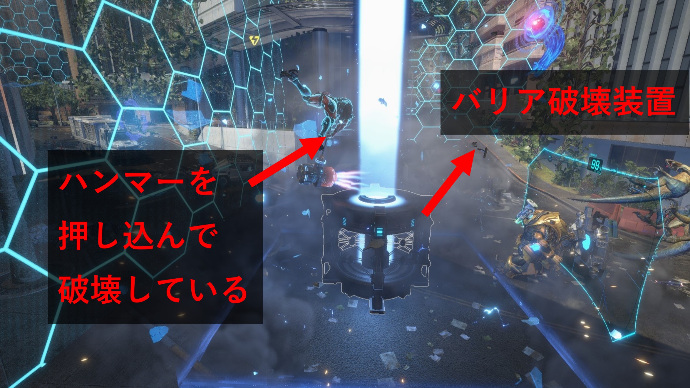 バリア破壊装置は、エリア1~3の合計3つのエリアに配置されています。エリア1の破壊装置を壊した後、そこで初めてエリア2へ向かう事が出来ます。 バリア装置を壊すにはハンマーのチャージ率をMAXにする必要があり、そのためには恐竜をどんどん倒してパワーをチャージしていこう!というゲーム性です。