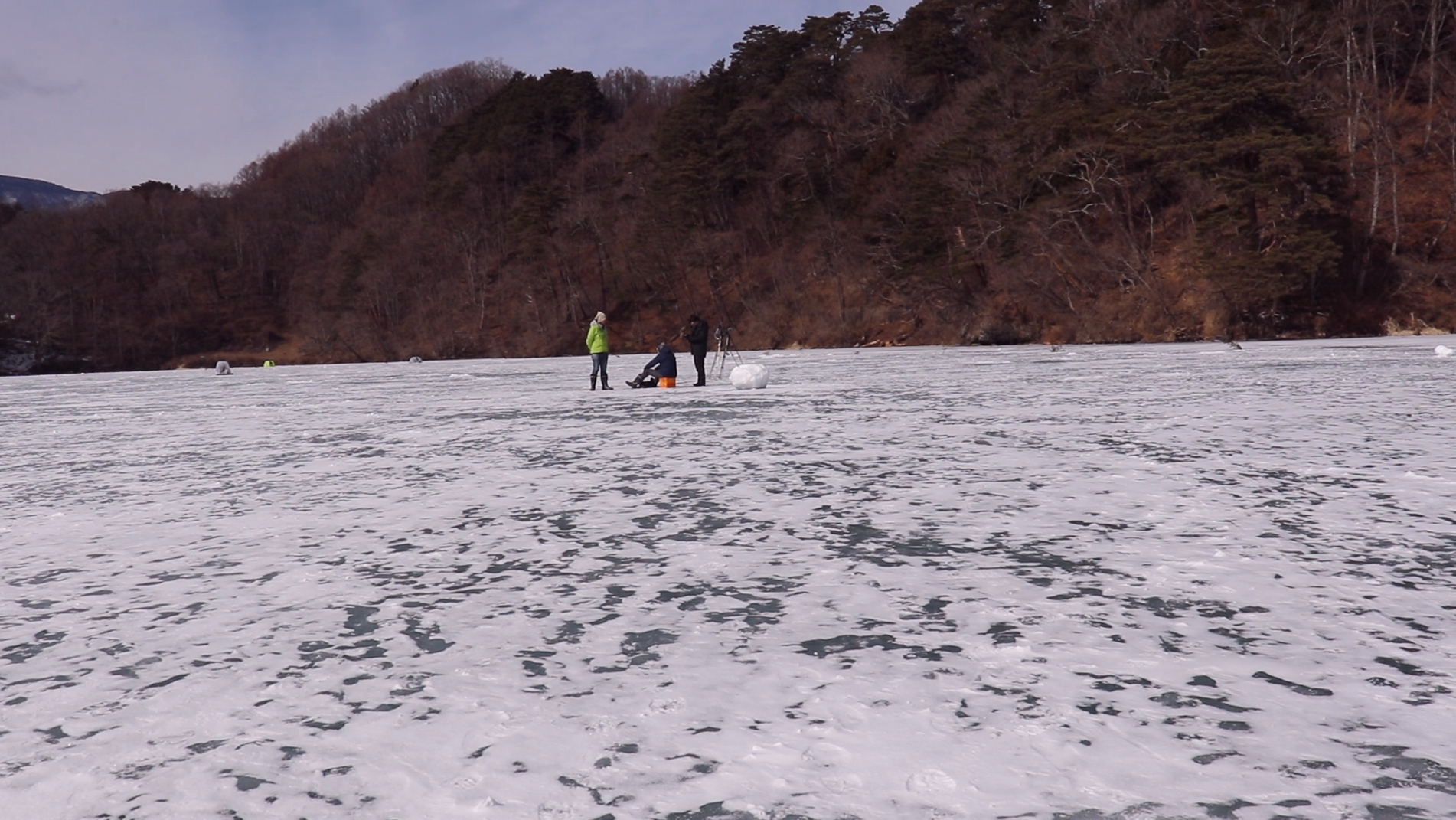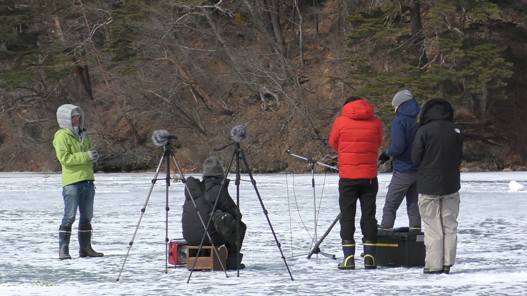 事前に社内で凍った湖の音や割れる音、海の波が凍る音など調べていたのですが、現場ではやはりネットだけでは得られない経験の宝庫でしたね。正直最初は、凍った湖の中ってどんな音の響きなんやろ…くらいの期待だったのですが、収録日前日の夜に湖畔の宿に到着後すぐにその期待を超えてきました。前日の夜にせっかくなので何人かのスタッフと宿の周辺を散策していた時、「ピュイーン…」といった音が聞こえてきたんです。最初は動物の鳴き声かと思ったのですが、後にそれが湖から聞こえる音とわかってもうテンションマックスになりましたね 笑 早朝から収録をはじめて実際にマイクを湖に落としたら、氷のぶつかる音、軋む音が生々しく聞こえて、想像していた静寂とは全く違う音の世界が広がっていたんですよね。こういった情景ってやっぱり実際に行って、実際に収録しないと絶対知ることはなかったと思うので、やっぱり現地に行く面白さや重要性を感じましたね。…ただですね、本当に、本当に…!寒かったですね。凍った湖の上に何時間も音を立てないように立ち続けるわけですから、スノボーなどで感じる寒さの比ではなかったですね。収録中はもちろん無言ですが、最早寒すぎて言葉が出てこなかったですね 笑 マイクやスピーカー達も本当によく頑張ってくれました。彼らは時には凍りながら、電源を落としながら、蘇生を繰り返し最後までやりきってくれました!我々サウンドチームの戦友のような存在ですね。本当に感謝しております。